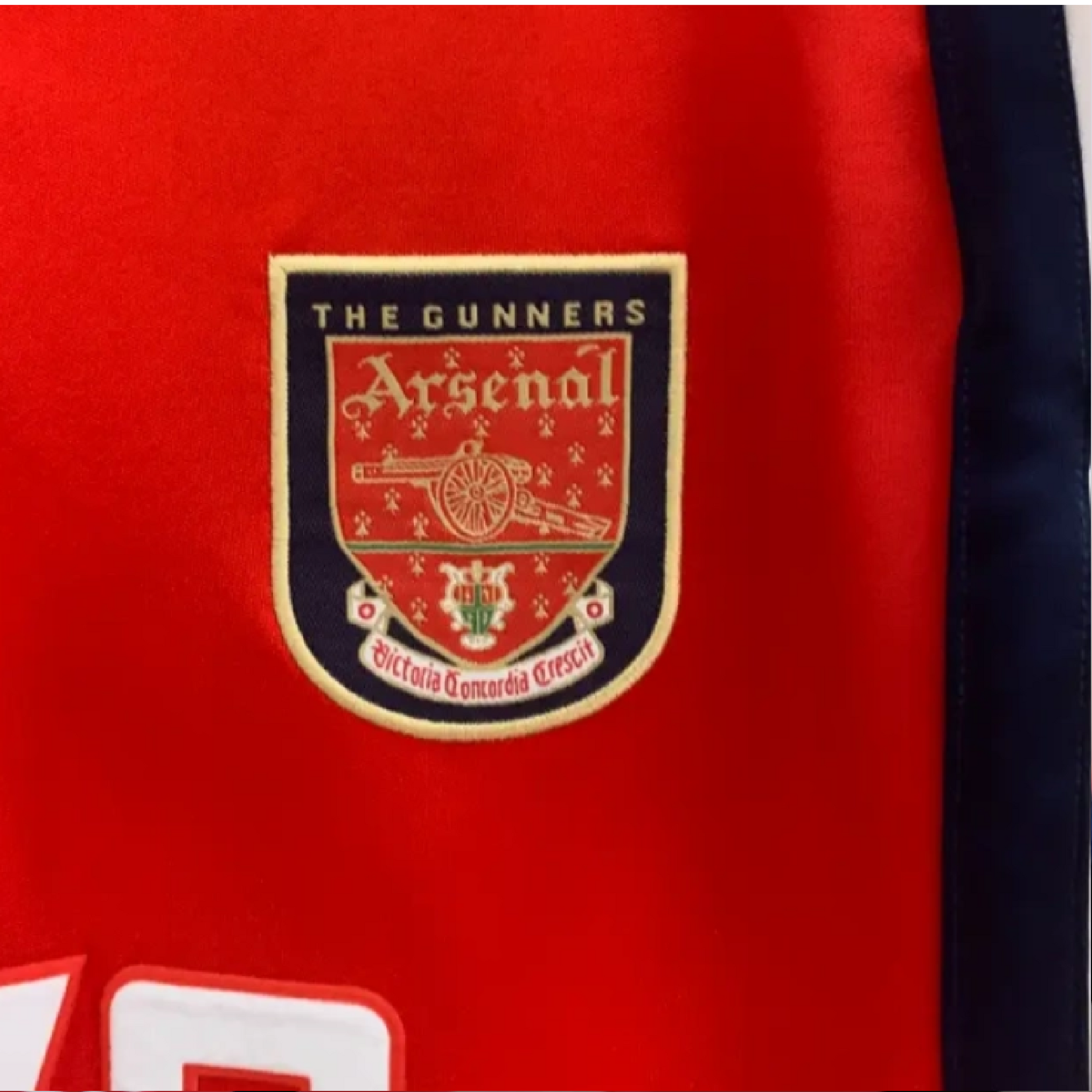 The 1998–99 Arsenal home jersey is one of the most iconic designs of the early Arsène Wenger era. Produced by Nike, it features the classic red body with white sleeves, paired with crisp detailing and the timeless JVC sponsor—appearing for the final season before the transition to SEGA. A sharp white fold-over collar with red trim gives the shirt a smart, traditional look, blending heritage with late-90s style. This jersey was worn by a legendary squad including Dennis Bergkamp, Patrick Vieira, Thierry Henry (in his debut season), Tony Adams, Marc Overmars, and David Seaman. Following the 1997–98 double-winning campaign, the kit became closely associated with Arsenal’s rise into one of Europe’s elite sides. Clean, classic, and instantly recognizable, the 98–99 home shirt remains a fan favorite and a must-have retro piece for collectors and supporters alike.