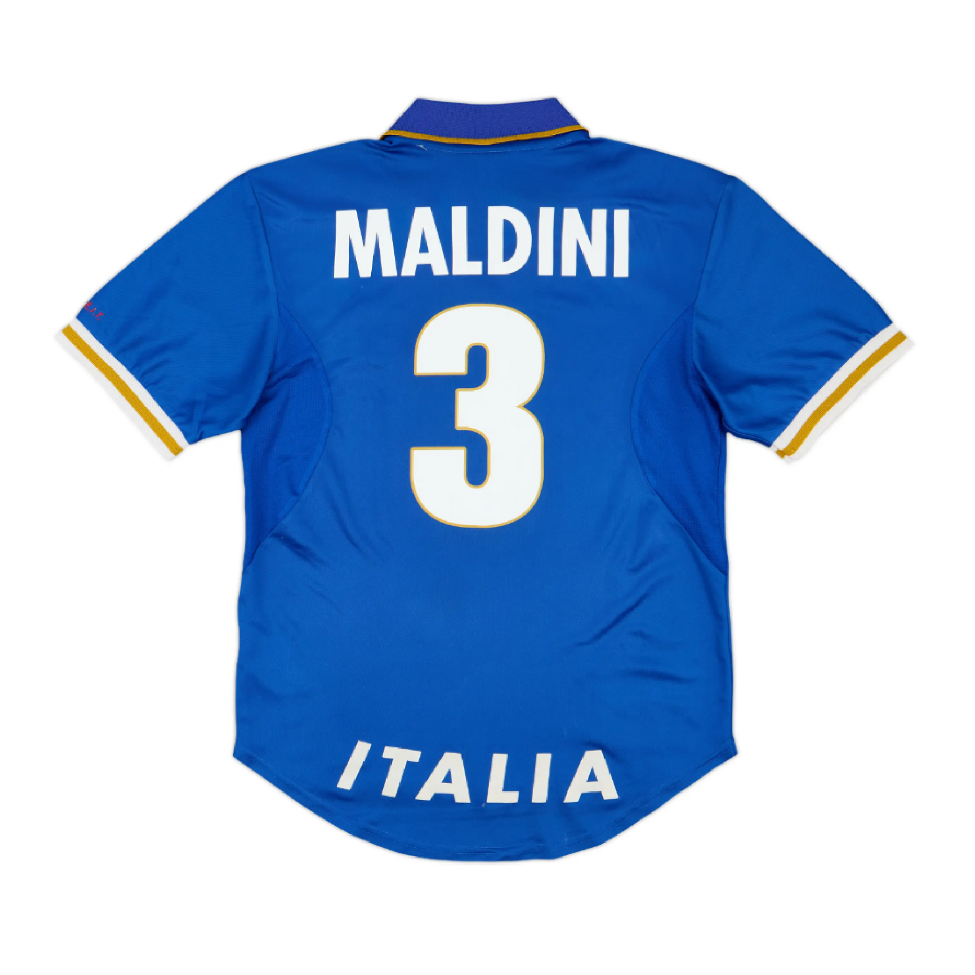 Relive the defensive mastery of a legend with the Italy 1996 Home Retro Jersey, featuring Paolo Maldini's name and iconic number 3. This classic Azzurri shirt captures the elegance, leadership, and skill that Maldini brought to the pitch during the UEFA Euro 1996 tournament and World Cup qualifiers. The jersey features a classic vibrant blue design with distinctive gold and white accents on the collar and sleeve cuffs, symbolizing quality and prestige. The official manufacturer was Nike, and there was no primary shirt sponsor for the national team jersey during this era. Both authentic originals and quality modern replicas offer lightweight comfort and breathability, often utilizing technologies like Nike's 'Dri-FIT'. Paolo Maldini consistently wore the number 3 shirt for the Italian national team. During this period, he was a pivotal figure in the defense, known for his perfect tackling, vision, and ability to read the game. He played alongside other club legends such as Roberto Baggio, Gianfranco Zola, and Alessandro Nesta. This jersey is a tribute to one of football's greatest defenders and a timeless piece of Italian football history.