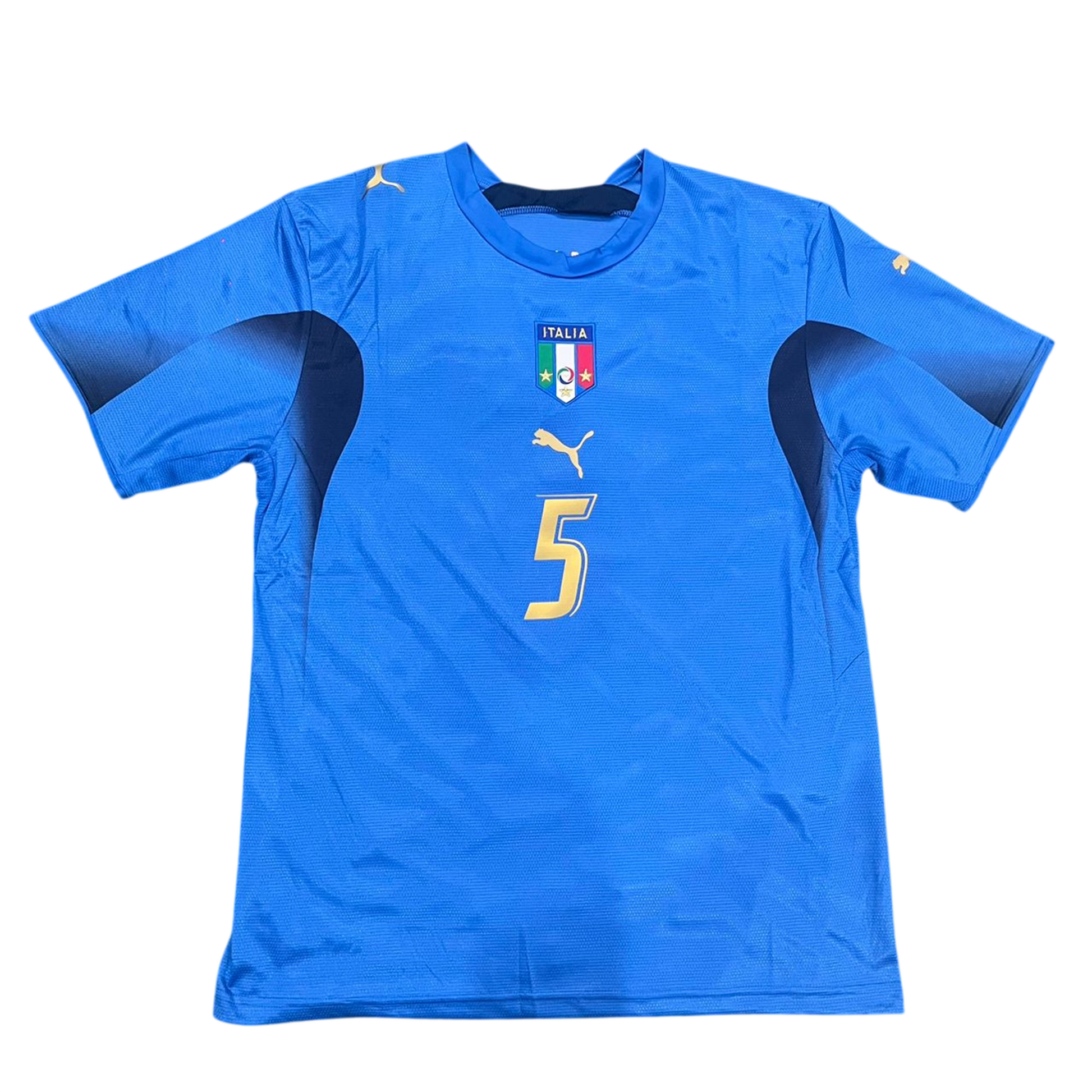 Relive the glory of Italy's 2006 World Cup victory with this iconic Italy 2006 Home Retro Jersey, featuring legendary captain Fabio Cannavaro and his famous #5 on the back. This shirt symbolises the moment the Azzurri lifted their fourth World Cup trophy in Berlin. Manufactured by Puma, this jersey is a classic representation of Italian football heritage. The traditional Azzurri blue base features a clean, sharp design with subtle detailing around the collar. This shirt became legendary as Italy showcased a masterclass in defensive resilience and teamwork throughout the tournament, ultimately defeating France in the final via a penalty shootout. Fabio Cannavaro was an absolute rock at the heart of the Italian defense and the inspirational captain of the 2006 World Cup-winning side. Known for his impeccable positioning, leadership qualities, anticipation, and ability to dominate even the biggest strikers despite his height, he had an immaculate tournament. His performances earned him the 2006 Ballon d'Or and FIFA World Player of the Year awards, making him one of the few defenders ever to receive such accolades. His #5 jersey is synonymous with defensive brilliance and ultimate glory.
