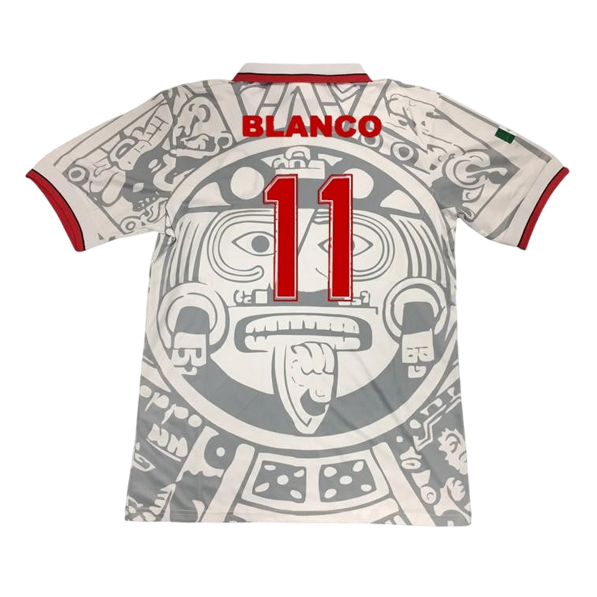 Relive the magic of the 1998 World Cup in France with the Mexico Away Retro Jersey, featuring Cuauhtémoc Blanco's name and iconic number 11. This classic white shirt captures the flair, creativity, and fighting spirit of El Tri during a memorable tournament. The jersey features a stunning, intricate graphic pattern inspired by Aztec ancestors and Mesoamerican culture embedded in the fabric, reflecting Mexico's deep historical roots and making it one of the most aesthetically unique jerseys of the 90s era. The original manufacturer was the Mexican brand ABA Sport. Cuauhtémoc Blanco wore the number 11 shirt, an iconic figure known for his unique "Blanco bounce" move to beat defenders. He played alongside other legends such as Luis Hernández, Claudio Suárez, and Pável Pardo. This jersey remains a sought-after classic and a true piece of Mexican football history.