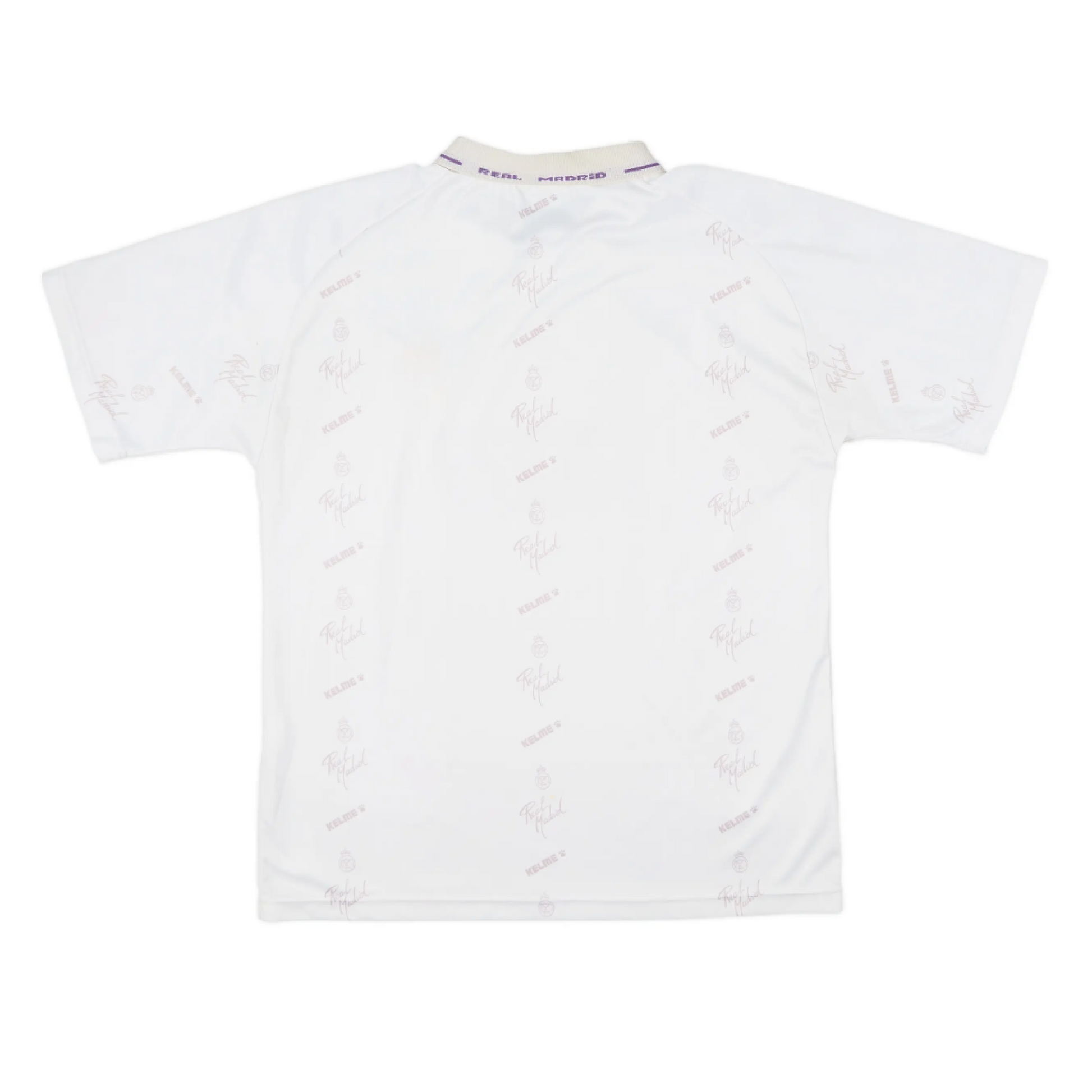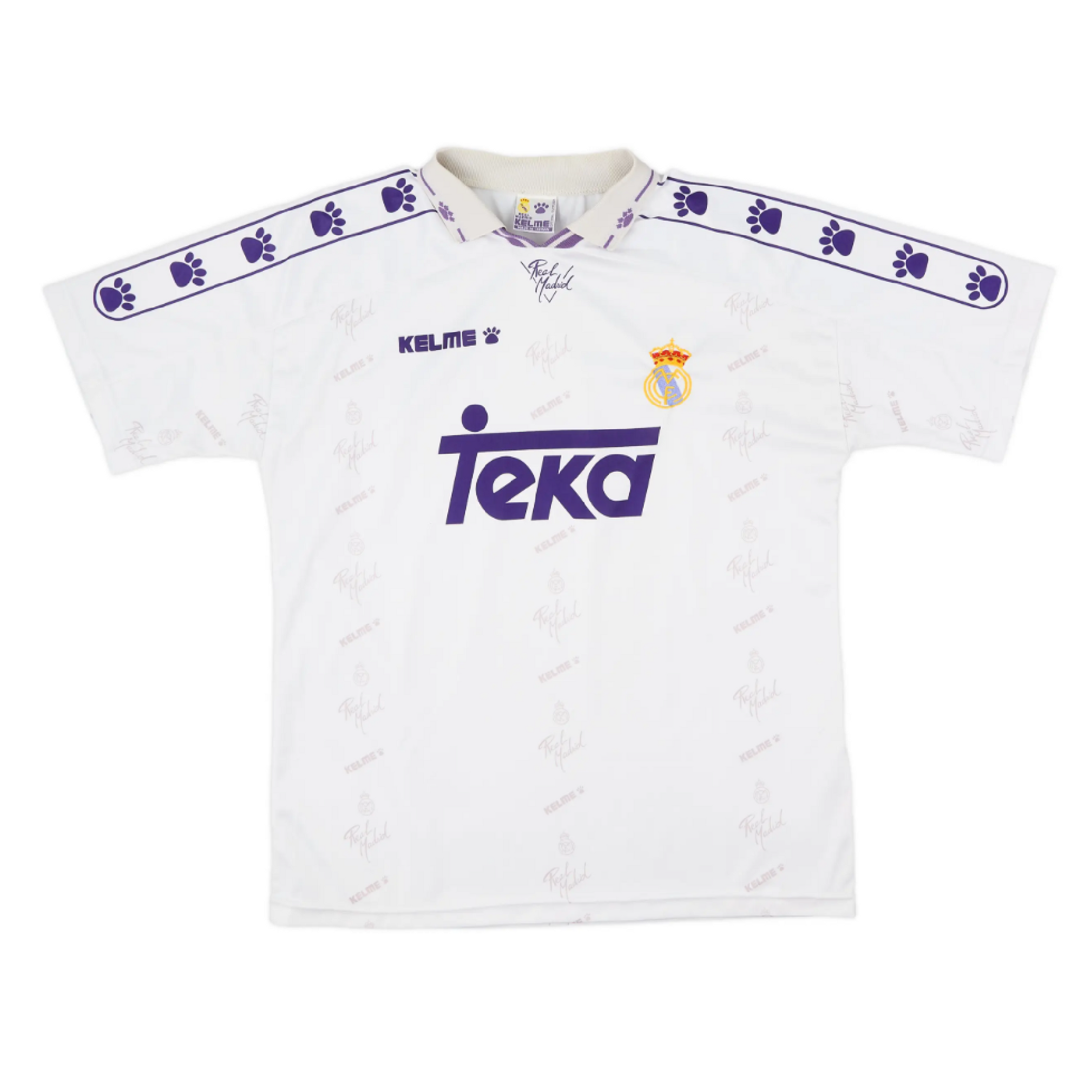 Relive the glory days of the mid-90s with the Real Madrid 1994-96 Home Retro Jersey. This classic white shirt captures the dominance and style that saw Los Blancos reclaim the La Liga title in the 1994-95 season under manager Jorge Valdano. The jersey features the classic all-white design synonymous with the club's history, with subtle Kelme and club crest watermarks woven into the fabric. The official manufacturer was Kelme, known for their distinctive branding on the sleeves. The prominent sponsor displayed across the chest was Teka, a long-standing and recognizable partnership from that era. This iconic kit was worn by a squad of international superstars and club legends, including the league's top scorer Iván Zamorano (#9), Fernando Hierro (#5), Michael Laudrup, Raúl, and Luis Enrique. A defining moment for the shirt was the historic 5-0 victory over arch-rivals Barcelona.
