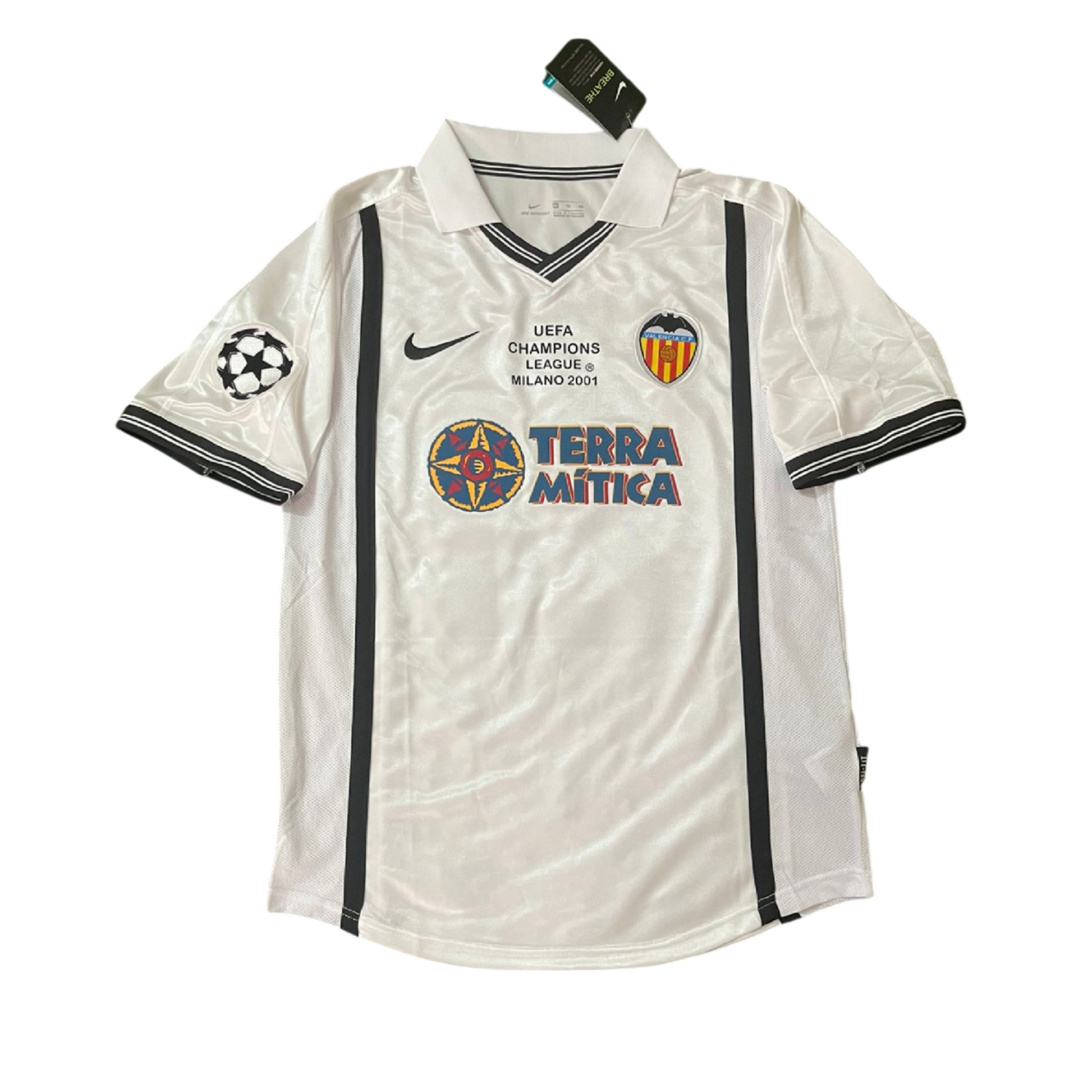 Relive the arrival of the "Clown" to La Liga with the Valencia CF 2000-01 Home Retro Jersey, featuring Pablo Aimar's name and iconic number 21. This classic shirt captures the technical wizardry, agility, and flair that the Argentine playmaker brought to the Mestalla as Valencia reached the UEFA Champions League final for a second consecutive year. The jersey features the classic all-white design with black and orange accents on the collar and sleeves. The official manufacturer was Nike, and the prominent sponsor displayed across the chest was the online betting company Terra Mítica, the name of a local theme park. Both authentic originals and quality modern replicas utilized period-appropriate polyester materials for comfort. Pablo Aimar wore the number 21 shirt during this campaign after a mid-season transfer from River Plate. He quickly established a brilliant understanding with the team's attack. He was a pivotal figure in a squad of local talents and international stars, including Gaizka Mendieta, Santiago Cañizares, Rubén Baraja, and John Carew. This jersey is a tribute to one of Valencia's most beloved modern legends and a highly sought-after classic.