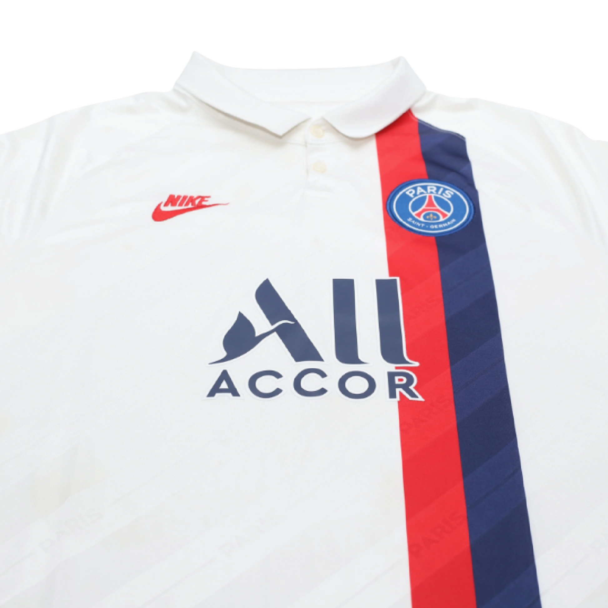 Relive the iconic start of a partnership and a treble-winning season with the Paris Saint-Germain 2019-20 Third Retro Jersey. This classic shirt captures the 90s-inspired aesthetics that saw the club dominate French football and secure a domestic treble during the 2019-20 season. The jersey draws inspiration from the club's classic 1989-90 look, Nike's debut season with the club. It features a clean white design with a classic fold-over, two-button polo collar, and a vivid red and blue vertical stripe running down the left side. The retro Nike Futura logo is featured on the right chest, a detail rolled out across all of Nike's 2019-20 third kits. This kit was worn by a squad of superstars and future club legends, including Kylian Mbappé (#7) and Neymar. The team was awarded the championship based on a points-per-game ratio due to the early cancellation of the Ligue 1 season and went on to win both the Coupe de France and the Coupe de la Ligue.