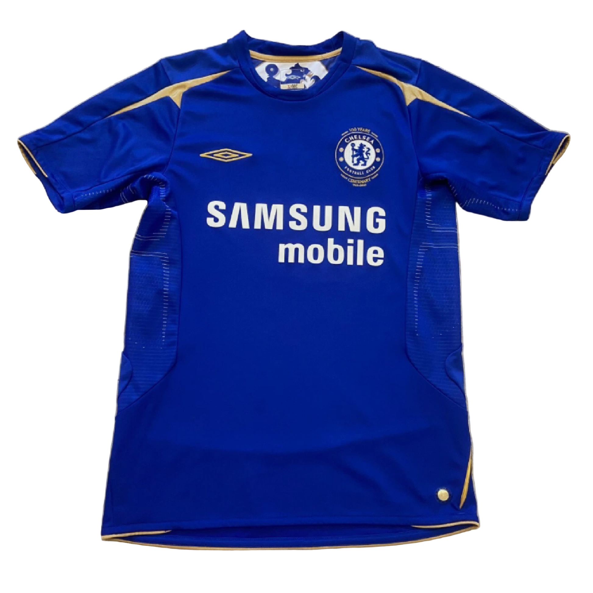 This iconic royal blue shirt, manufactured by Umbro and featuring the Samsung Mobile sponsor, is a special centenary edition. The club crest is elegantly embroidered with gold accents and the inscription "100 Years, Centenary 1905-2005", commemorating a pivotal milestone in Chelsea's history. This was the shirt worn as José Mourinho's formidable side secured their second consecutive Premier League title, establishing themselves as the preeminent force in English football. The jersey features the name and number of midfield maestro Frank Lampard. In the 2005-06 season, Lampard was the team's top scorer with 16 league goals from midfield, a testament to his intelligence, professionalism, and relentless drive. He was a crucial part of the spine of the team that went on to set a Premier League record of nine consecutive wins from the start of the season and remained unbeaten at Stamford Bridge for the entire calendar year.