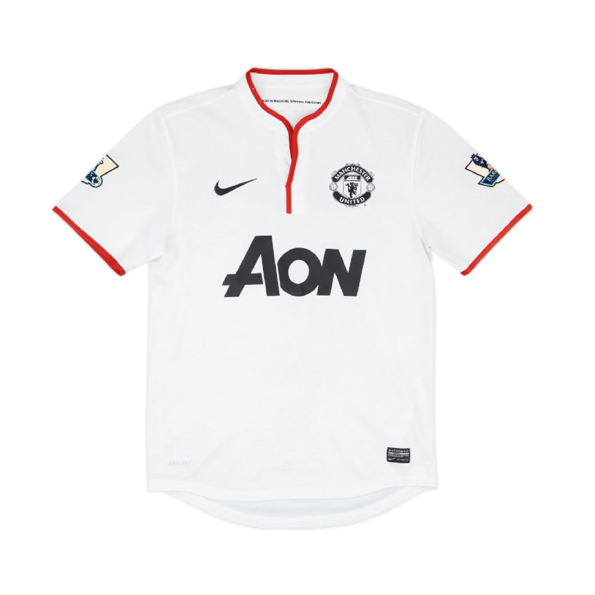 Relive the iconic first season of Robin van Persie with the Manchester United 2012-14 Away Retro Jersey, featuring his name and iconic number 20. This classic shirt captures the sheer goalscoring prowess that fired United to a historic 20th Premier League title in Sir Alex Ferguson's final, unforgettable season. The jersey features a clean white design with black and red accents, including a classic black crew neck collar. The most recognizable feature is a subtle but bold red-and-black checkered trim on the cuffs. The official manufacturer was Nike, and the prominent sponsor displayed across the chest was Aon. Robin van Persie wore the number 20 shirt and famously wore this exact kit when he scored a crucial hat-trick in a 3-2 comeback win against Southampton early in the season. He was the league's top scorer and a pivotal figure in a squad that included legends such as Wayne Rooney (#10), Paul Scholes, and Ryan Giggs. This jersey is a tribute to one of the Premier League's most lethal strikers and a defining moment in Manchester United history.