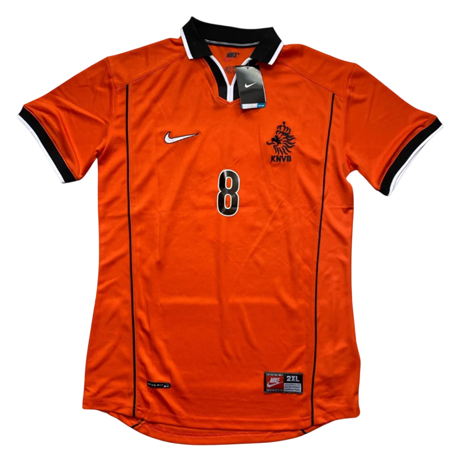 Own a piece of footballing artistry with this iconic Nike Men's Netherlands 1998 Home Retro Jersey, complete with the legendary striker Dennis Bergkamp #8 printing on the back. This is the exact shirt worn by Oranje during the 1998 FIFA World Cup in France, where a talented Dutch side captivated the world with their stylish play and came within a whisker of the final. This jersey is synonymous with one of the most aesthetically pleasing teams in Dutch history, featuring stars like the midfield general Edgar Davids, the pace of Marc Overmars, and the sheer genius of Bergkamp. Relive the moment Bergkamp scored arguably one of the greatest World Cup goals of all time in the quarter-final against Argentina—a moment of sublime control, touch, and finish that epitomized his brilliance.