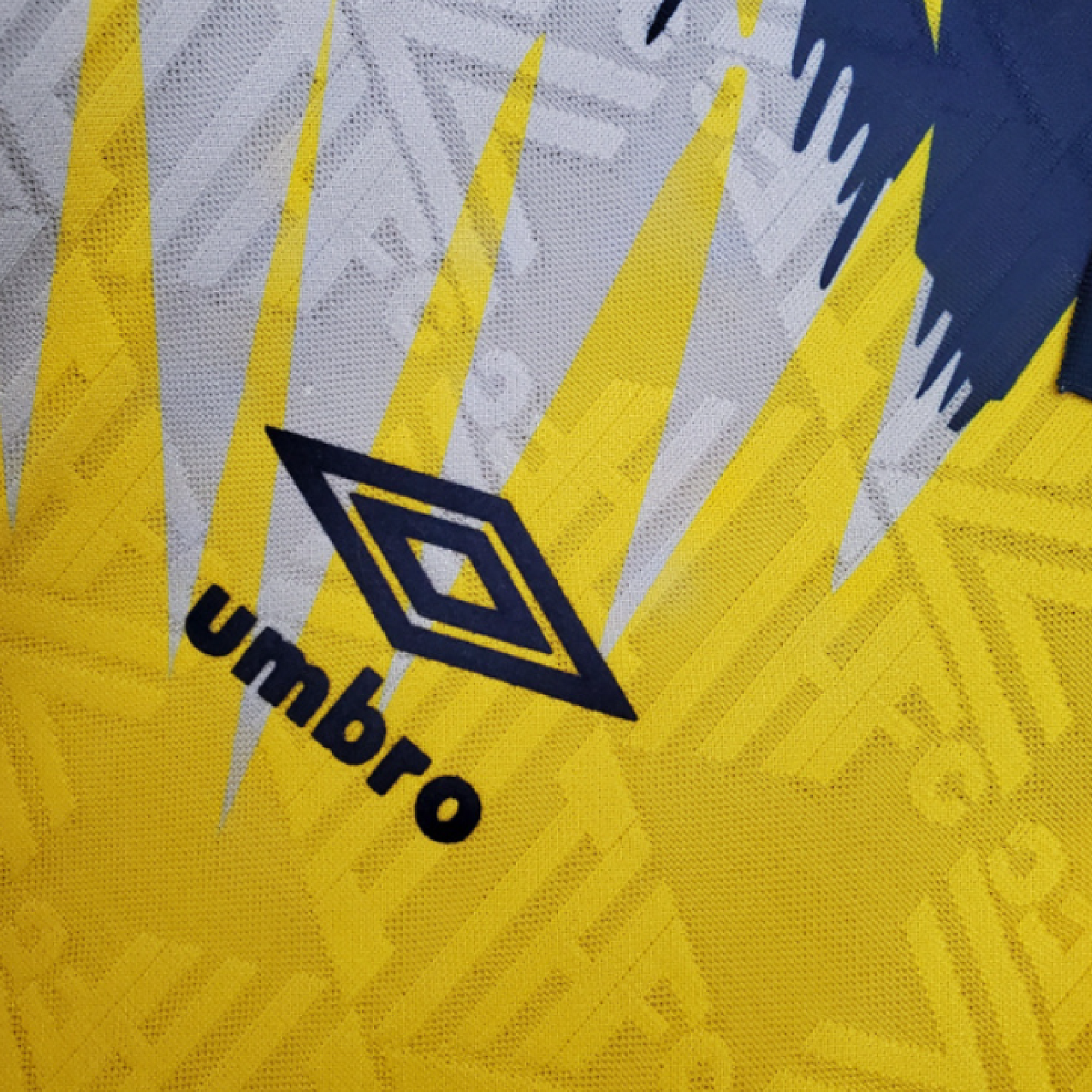 This classic away shirt, manufactured by Umbro and featuring the long-standing Holsten sponsor, is a firm fan favorite. Predominantly yellow with distinctive navy blue accents on the collar and cuffs, it was voted by fans as the club's most iconic away strip. The jersey was worn during seasons where Spurs reached the FA Cup and League Cup semi-finals, showcasing a competitive edge in the early Premier League era. The shirt bears the number of Teddy Sheringham, who joined Spurs in the summer of 1992 and immediately took the #10 jersey. He made an instant impact, establishing himself as one of the Premier League's finest forwards. Sheringham quickly became a hugely popular figure with fans, known for his intelligence, technical ability, and crucial goals.